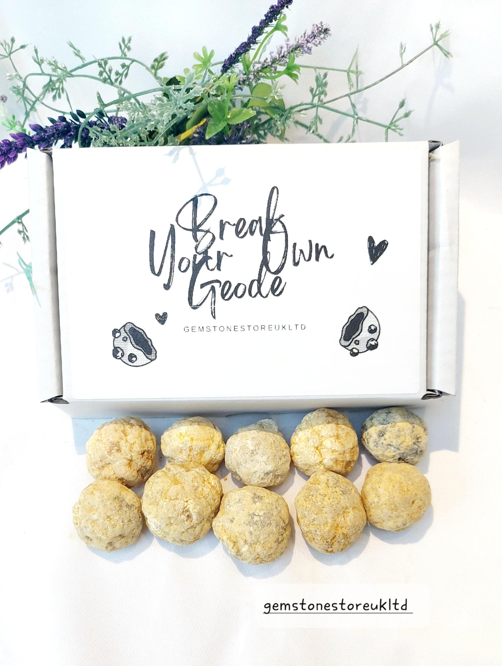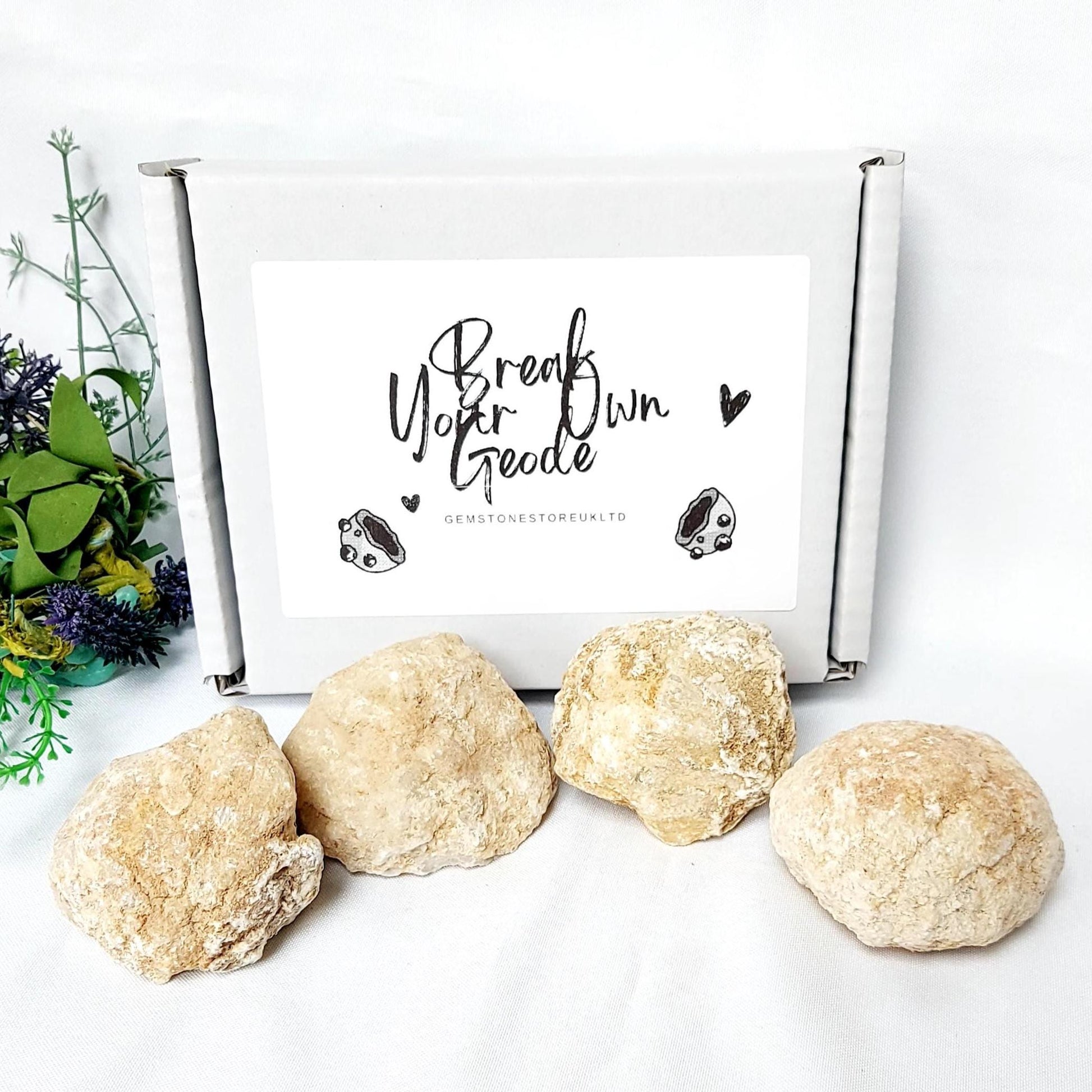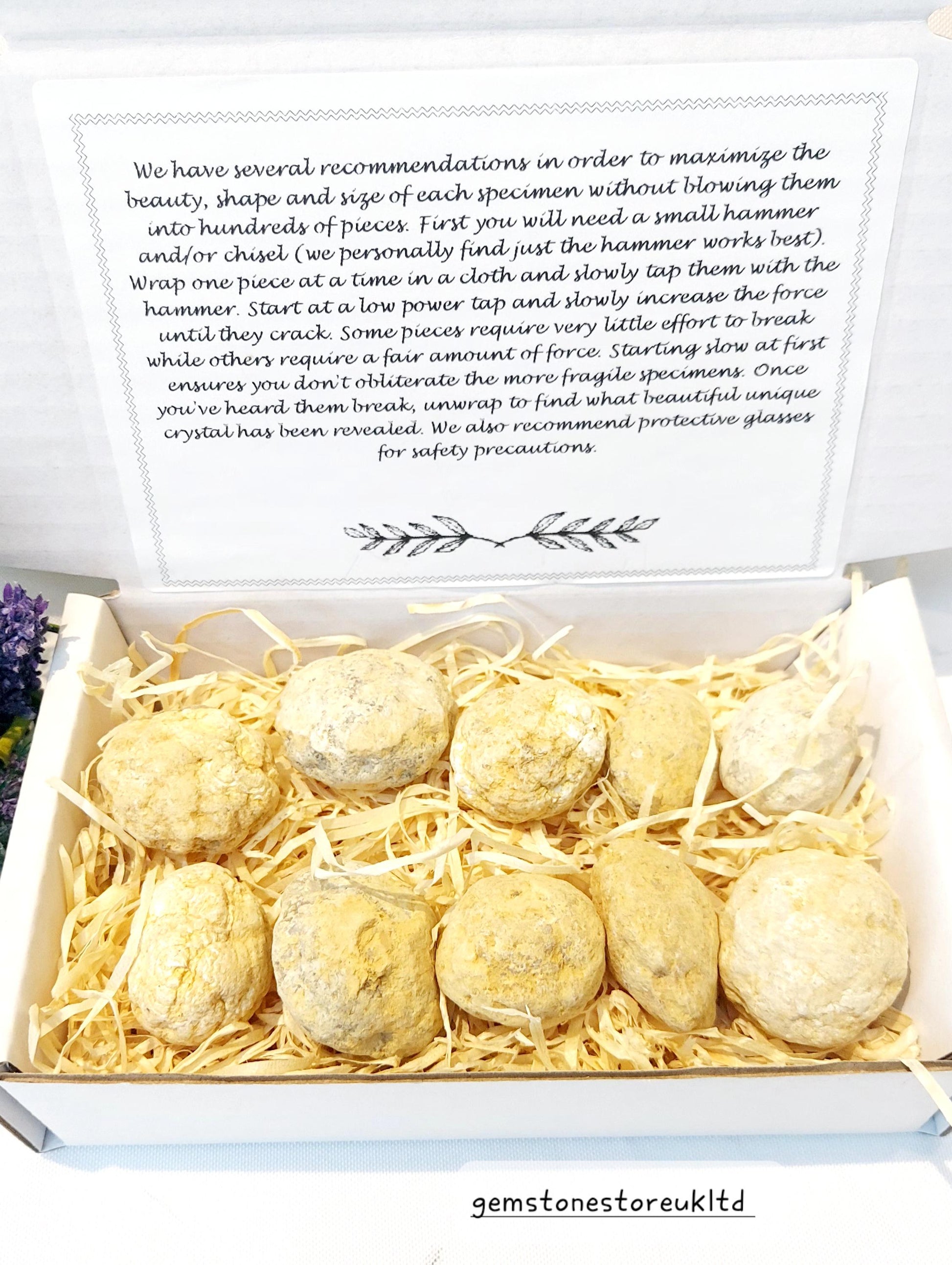 Instructions on how to safely crack open your geodes and reveal the crystals inside (as shown in the listing pictures) Ethically sourced, natural, and unique stones 🔍 Why You'll Love It: These break-your-own geodes are a thrilling, interactive experience for curious minds of all ages. Unleash the natural beauty hidden inside each geode as you crack it open to reveal the breathtaking crystals within. It’s not only a fun activity but also an educational experience for kids and adults alike, bringing the wonder of geology into your own hands.