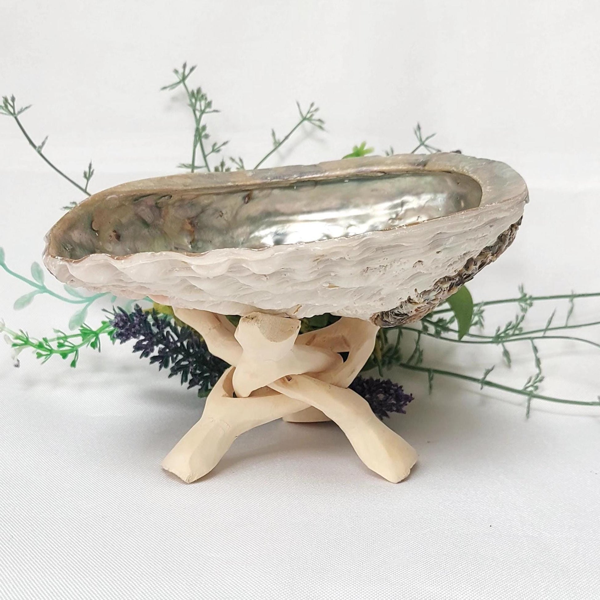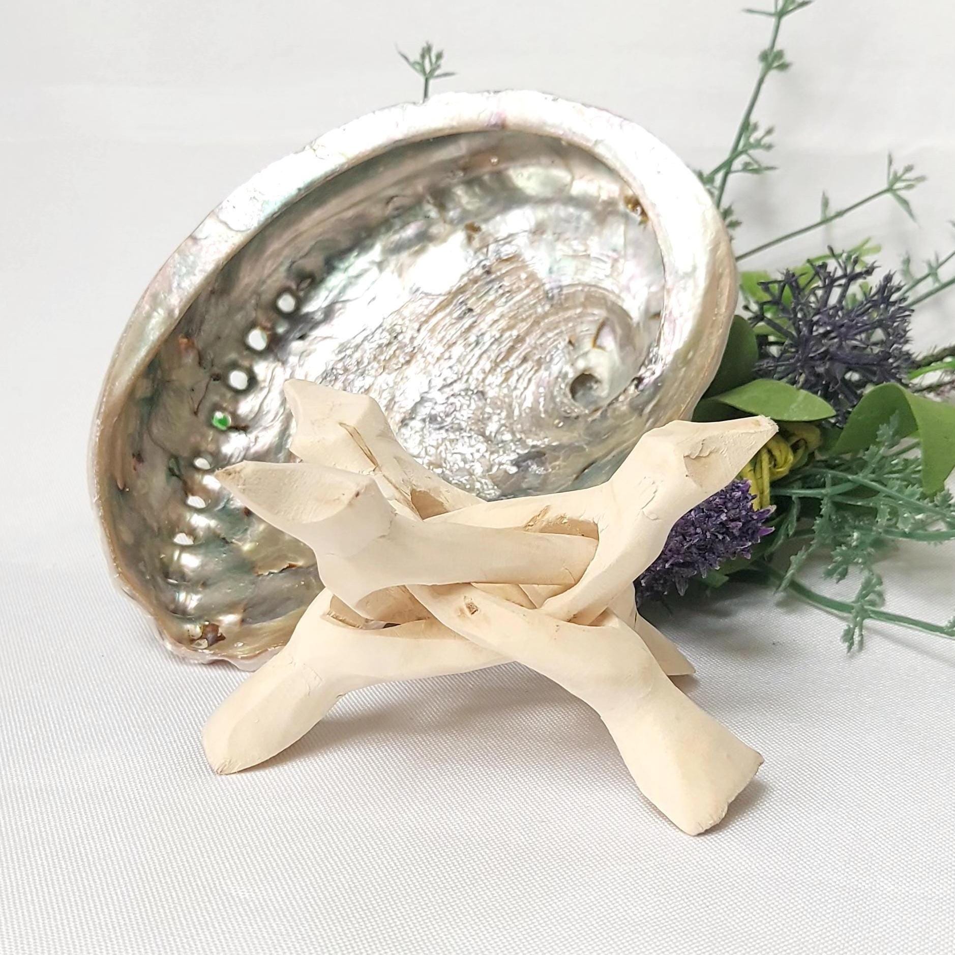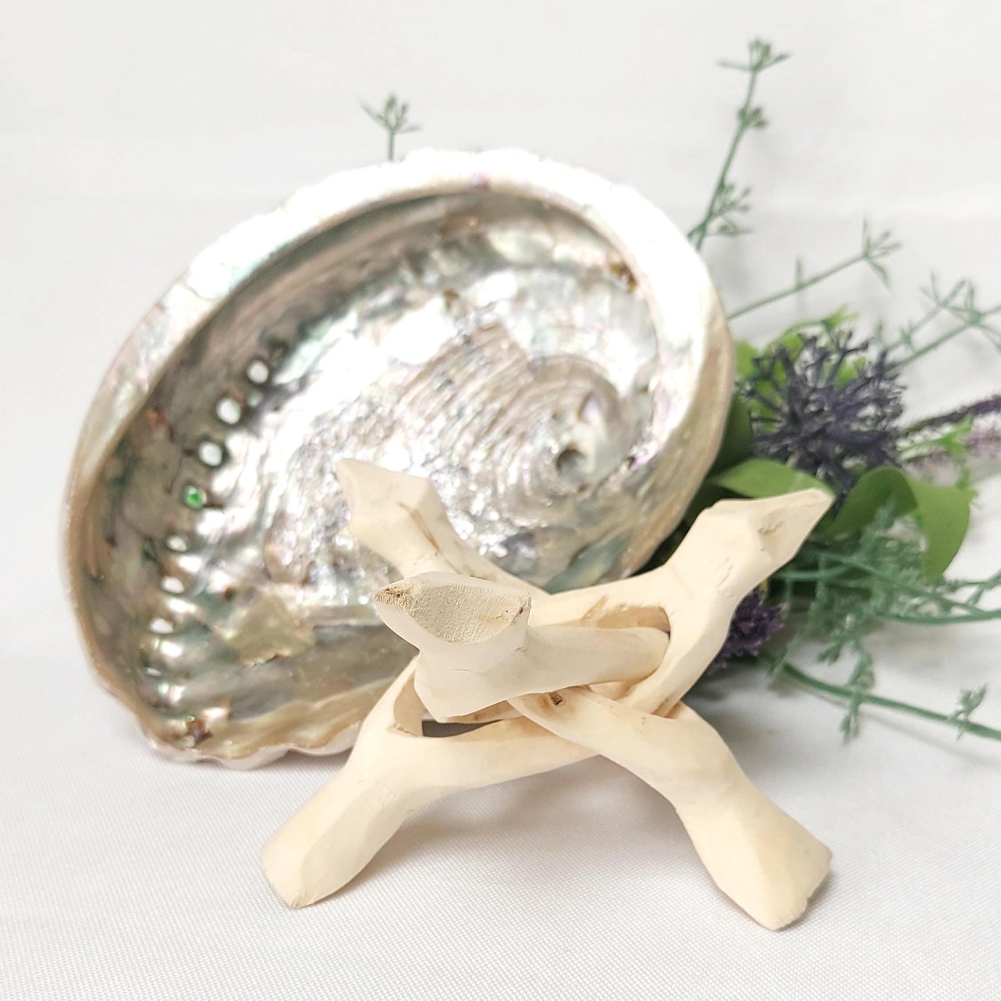 Abalone Shell & Wooden Tripod Stand Set, approx 12cm Smudge Bowl with Foldable Stand, Smudging Ritual Tool for Sage Incense Resin, UK Seller